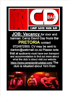 JOB: Vacancy for door and barman. Camp David Gay Nude Bar PRETORIA contact 0724972500. CV may be